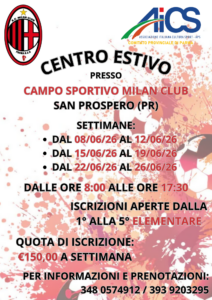 Centro Estivo Apr 16, 2026 | Comunicazioni, Eventi Vi aspettiamo numerosi al Centro Estivo in collaborazione con A.C. Milan Club Parma A.S.D.